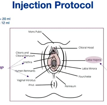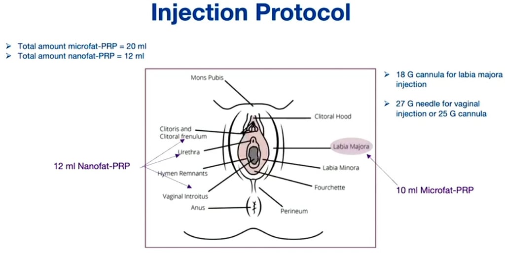Введення в ділянку великих статевих губ: суміш мікро- та наножиру вводиться в об’ємі від 12 до 15 мл у кожну губу. Для забезпечення рівномірності та мінімізації набряків використовується пристрій для контрольованої ін’єкції (наприклад, Lipopen). Ін’єкція проводиться під фасцію Дартоса.